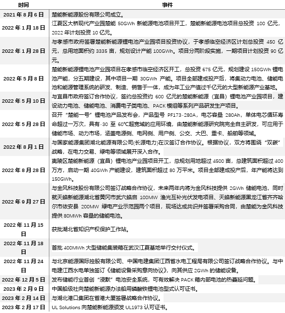 中國粉體網訊 2021年8月6日,湖北恒信汽車集團宣布,全資40億注冊楚能新能源股份有限公司,正式進軍新能源領域,競逐鋰電賽道。短短兩年間,楚能新能源從無到有,截至日前,投資已達1375億元,規劃鋰電池產能達到350GWh,完成了在湖北的一次性規劃產業布局,分別在武漢江夏、孝感、宜昌設立三大基地,梯次開工、投產。