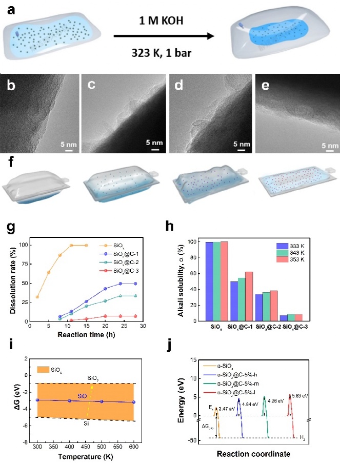 圖1.不同復(fù)合材料的包覆完整性方法及評價。a)堿溶法評價包覆完整性的反應(yīng)示意;b–e)不同復(fù)合材料的高分辨TEM圖像:b)原始SiOx;c)SiOx@C-1;d)SiOx@C-2;e)SiOx@C-3及f)對應(yīng)的鋁袋產(chǎn)氣膨脹狀態(tài)示意;g)不同復(fù)合材料的溶解速率隨反應(yīng)時間而變化。h)不同溫度下堿溶度α變化;i)SiOx(0≤x≤2)與KOH反應(yīng)的吉布斯自由能變化;j)不同堿溶度復(fù)合物堿溶反應(yīng)的能壘比較。