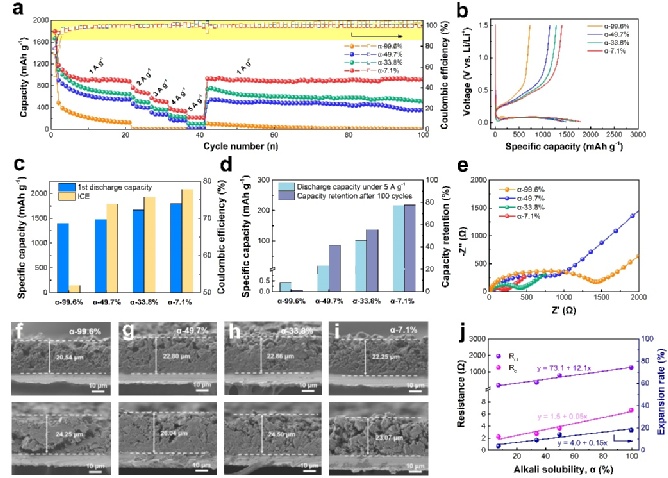 圖2.不同堿溶度SiOx@C復(fù)合物電化學(xué)性能和結(jié)構(gòu)穩(wěn)定性分析。a)倍率-循環(huán)性能;b)容量-電壓曲線;c)初始放電容量和ICE比較;d)100次循環(huán)后容量保持率和及5Ag-1下放電容量比較;e)100次循環(huán)后的EIS譜;f-i)100次循環(huán)前后不同堿溶度復(fù)合電極的厚度對比SEM;j)堿溶解度與阻抗及電極膨脹率關(guān)系。