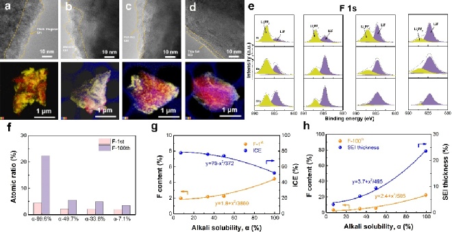 圖3.循環(huán)后電極表面形態(tài)和成分分析:a–d)不同堿溶度復(fù)合物電極的HRTEM和相應(yīng)EDS圖像:a)α-99.6%;b)α-49.7%;c)α-33.8%;d)α-7.1%;e)SEI中高分辨率F1sXPS光譜(α從左到右減小);f)不同堿溶度復(fù)合物電極的F含量統(tǒng)計;g)堿溶度與初始循環(huán)后SEI中F含量以及ICE關(guān)系;h)100次循環(huán)后堿溶度與F含量以及ICE關(guān)系。