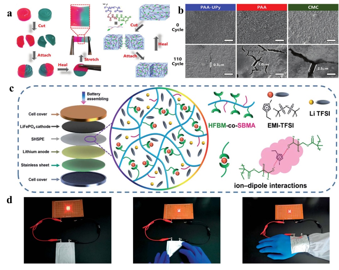 圖2.自修復聚合物作為(a,b)鋰離子電池Si負極黏合劑;(c,d)柔性鋰金屬電池固態電解質
