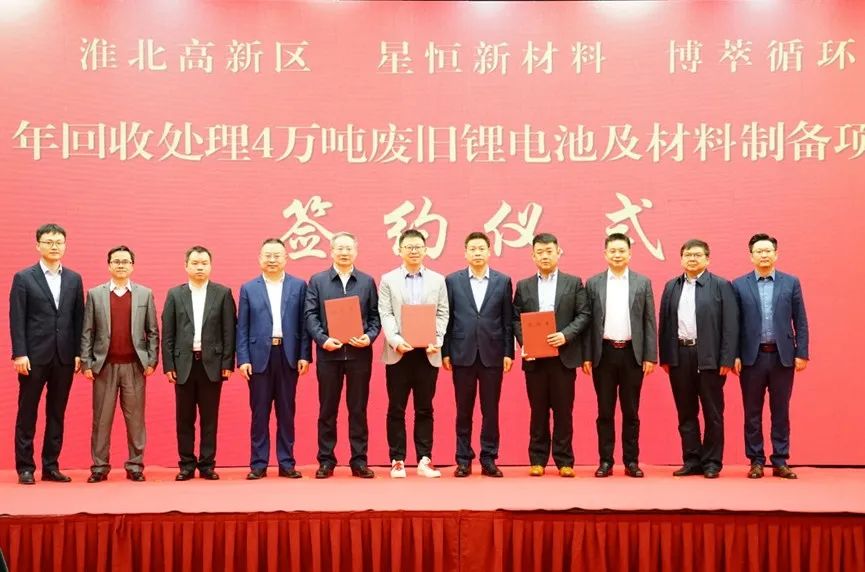 中國粉體網訊 3月12日,星恒新材料科技(滁州)有限公司與蘇州博萃循環科技有限公司,年回收處理4萬噸廢舊鋰電池及材料制備項目簽約儀式,在淮北市成功舉辦。