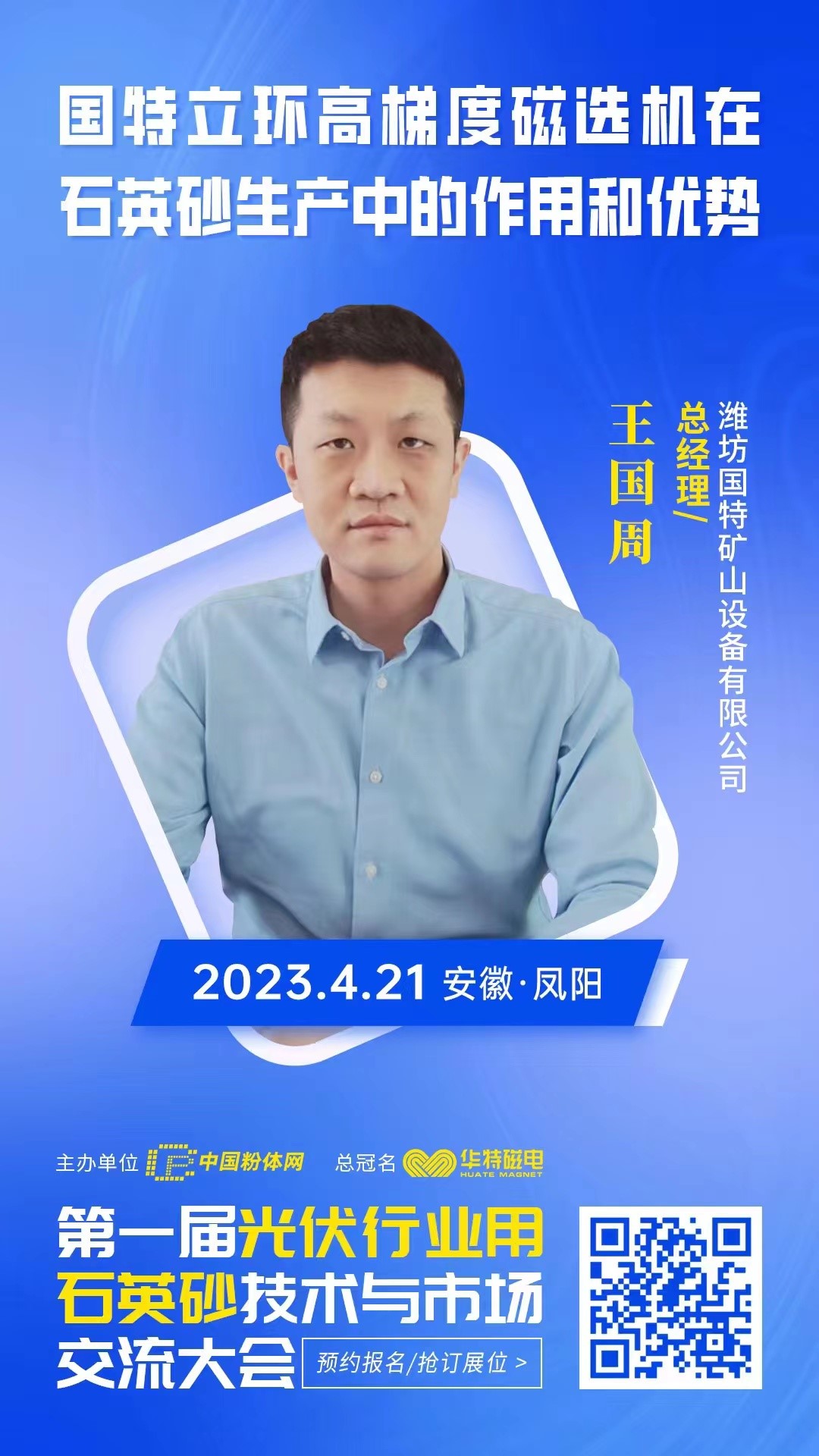 2023年4月21日,中國粉體網將在安徽鳳陽舉辦“第一屆光伏行業用石英砂技術與市場交流大會”。濰坊國特礦山設備有限公司總經理王國周將帶來題為《國特立環高梯度磁選機在石英砂生產中的作用和優勢》的報告。