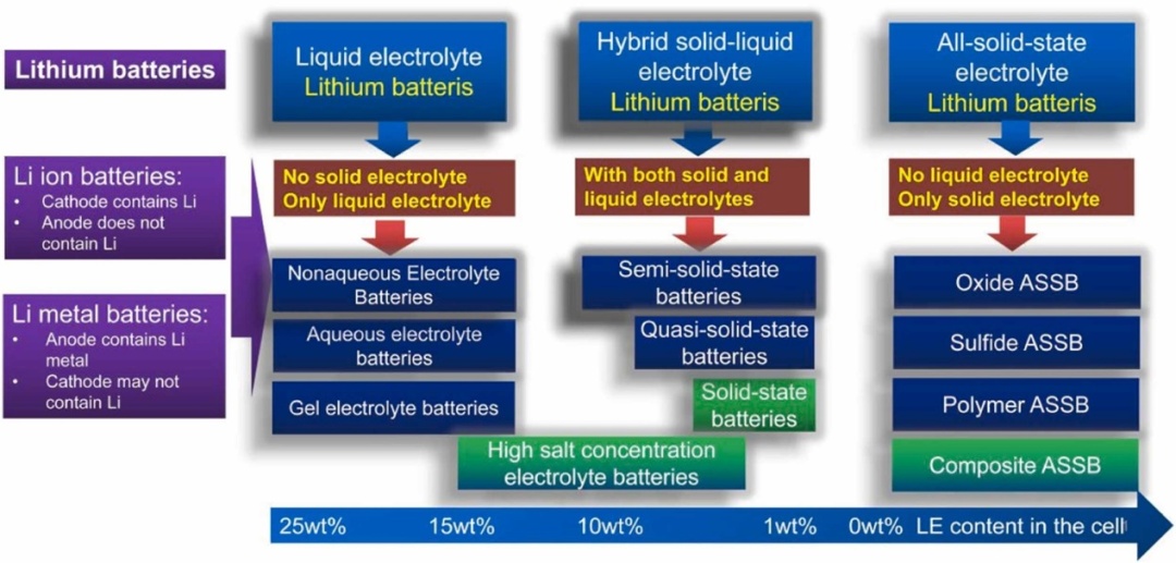 圖1從電解質角度對鋰離子電池和鋰金屬電池分類。