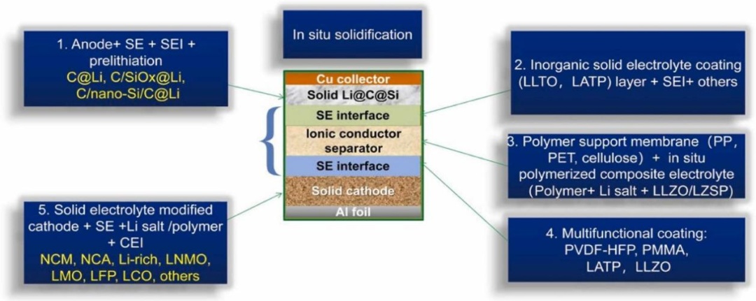 在混合固液電解質電池中引入固態電解質有5種實施路徑:在電極顆粒包覆超薄固態電解質層;使用固態電解質納米粒子填充隔膜和電極孔隙;在電極包覆和干燥過程將電解液轉化為固態電解質;電池注入液態電解液后將其轉化為固態電解質,利用電化學反應在化成、老化和循環過程將液態電解液轉化為固態電解質。