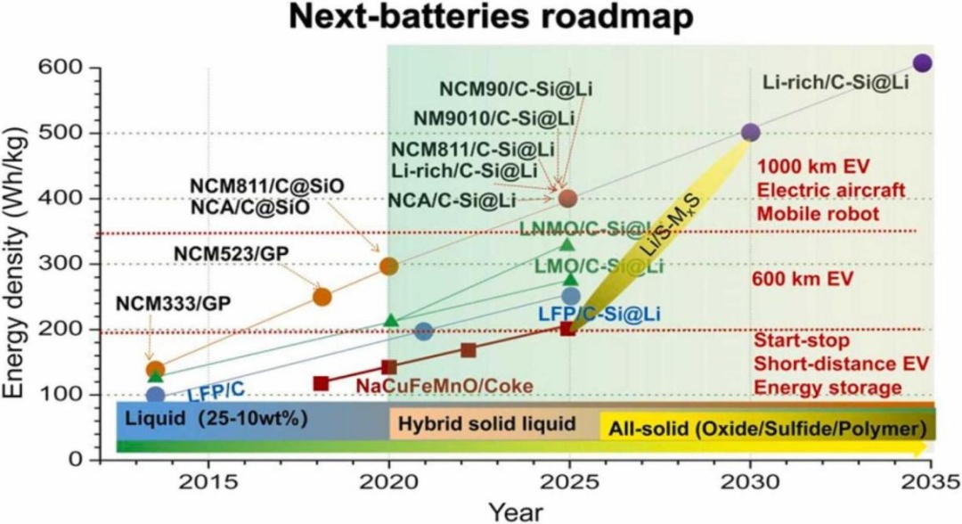 混合固液電解質電池和全固態電池在全世界被廣泛關注和發展。中國將在2023年實現GWh級的電動車混合固液電解質鋰離子電池的商業化。如果本文提到的技術策略能不斷發展和驗證,則最早在2026年后,GWh級的全固態電池將有望商業化。從能量密度與安全性綜合考慮,使用不同材料體系的電動車與儲能體系的電池技術路線供參考(如圖3所示)。
