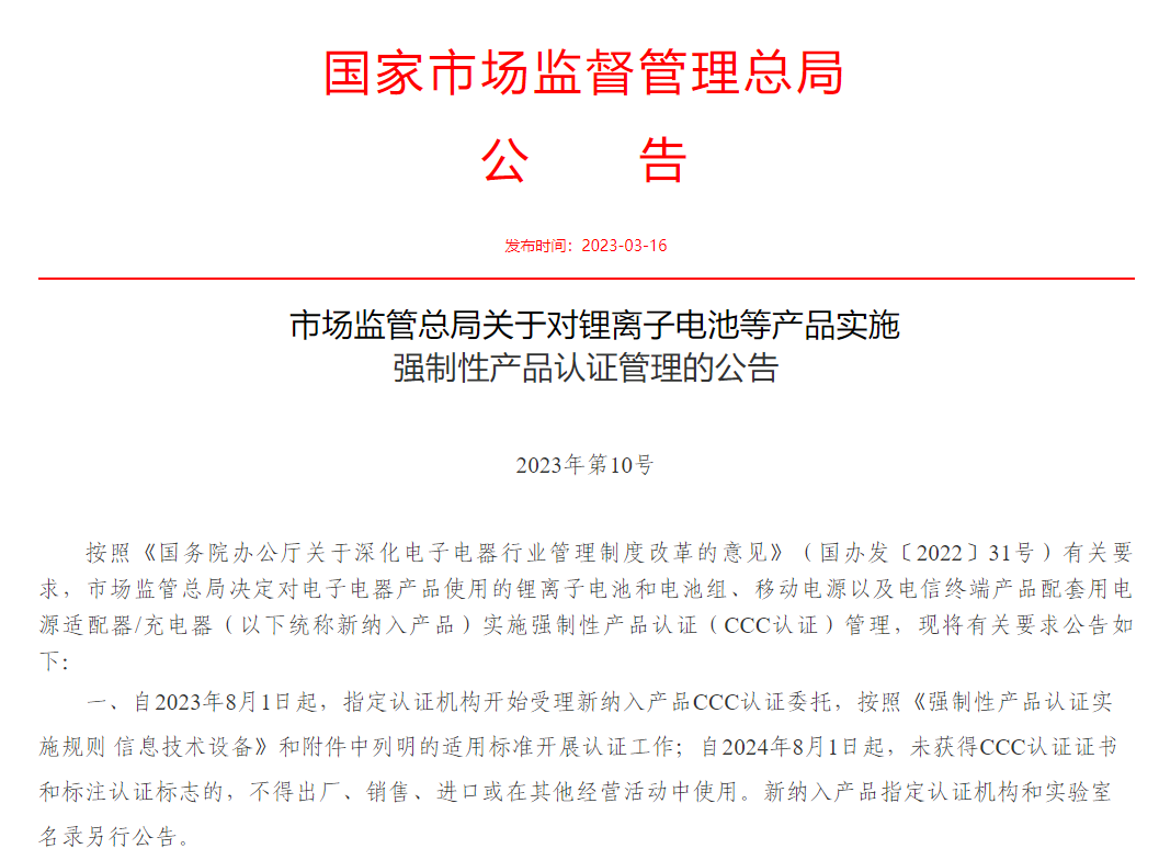 中國粉體網訊 3月16日,國家市場監督管理總局發布關于對鋰離子電池等產品實施強制性產品認證管理的公告。市場監管總局決定對電子電器產品使用的鋰離子電池和電池組、移動電源以及電信終端產品配套用電源適配器/充電器(以下統稱新納入產品)實施強制性產品認證(CCC認證)管理。