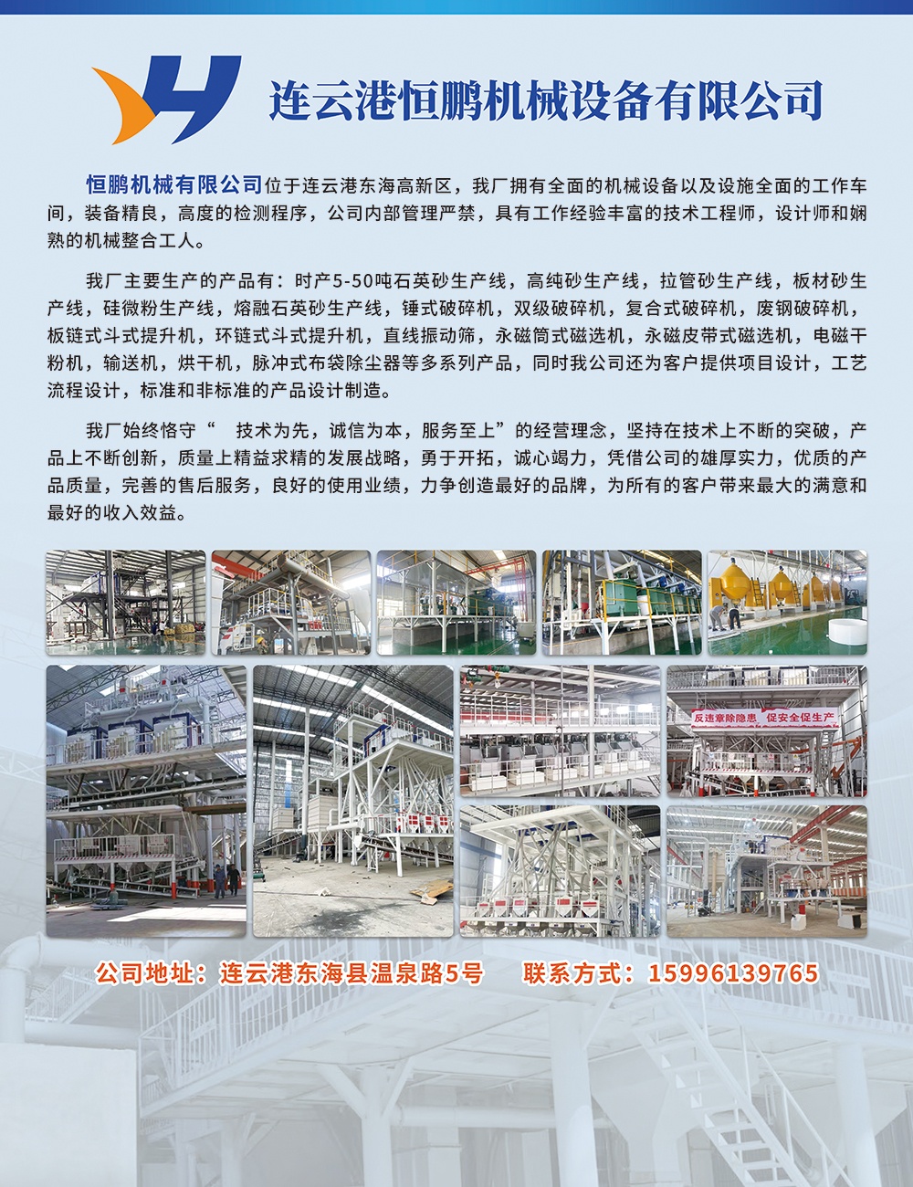 連云港恒鵬機械設備有限公司堅持高性價比、高合格率、高使用壽命產品路線,專業提供石英板材砂產線(4-120目),石英玻璃砂產線(40-160目),石英高純砂產線(80-200目),破碎、制砂、烘干、篩分、磁選、提升、除塵等設備及刀具等耗材配件