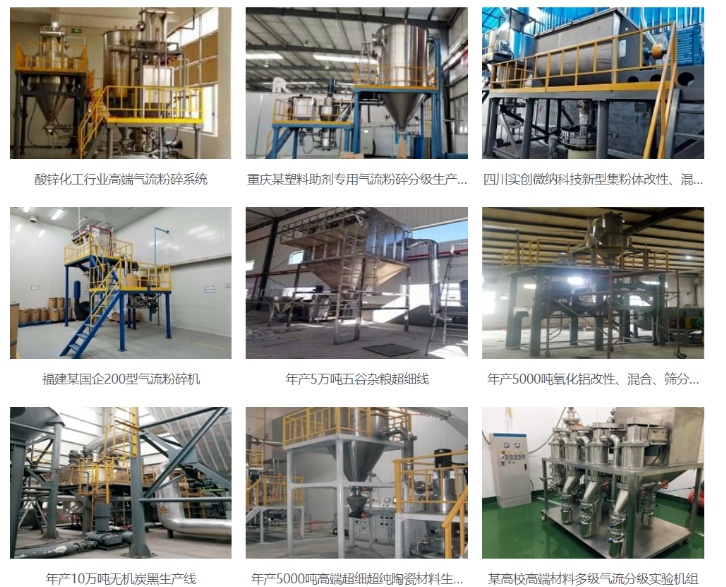 公司研制設備可以穩定生產0.5-25微米的微粉,也可生產20-200目的微粒。目前廣泛用于非金屬礦粉(1-74微米)、磨料微粉(符合國家標準、日本標準、歐洲標準)、精細化工、粉末冶金(惰性氣體保護)、鋰電池、新能源、復印機打印機碳粉、化工涂料、塑料填充、反光材料、醫藥食品(高純物料)、保健品、新型材料等領域。