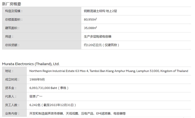 據(jù)了解,Murata Electronics (Thailand), Ltd.成立于1988年9月,主營業(yè)務(wù)為開發(fā)和制造超聲波傳感器、天線線圈、壓電產(chǎn)品、EMI濾波器、電容器等。