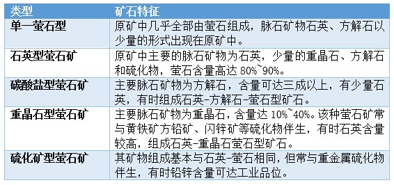 螢石礦床一般分為單一型螢石礦床和共伴生型螢石礦床,其中前者占53%,后者占47%。我國螢石礦床以沉積改造型和熱液充填型為主,礦山生產(chǎn)規(guī)模以中小型為主,總數(shù)超1200個(gè)。