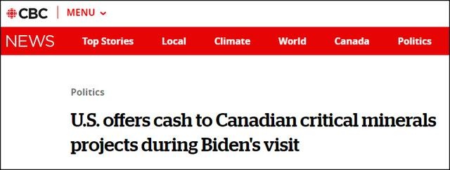 據加拿大廣播公司(CBC)3月25日報道,美國總統拜登和加拿大總理特魯多24日發表聯合聲明,宣布美國政府將向加拿大關鍵的礦產行業提供資金,以建立一個“強大、有彈性的北美關鍵礦產供應鏈”。這一舉動旨在提高美國與中國“競爭”的能力。
