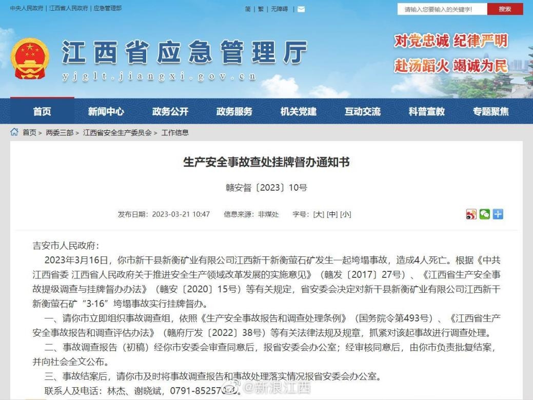 從江西省應急管理廳獲悉,江西省新干縣新衡螢石礦此前發生的一起垮塌事故已造成4人遇難,官方對該起垮塌事故實行掛牌督辦。
