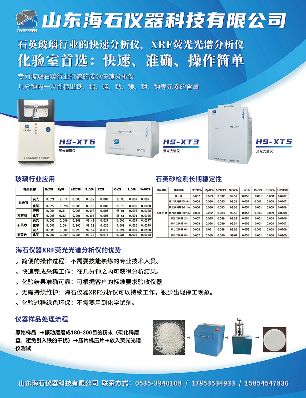 山東海石儀器科技有限公司 是一家專(zhuān)業(yè)從事X熒光光譜儀研發(fā)、生產(chǎn)和銷(xiāo)售的高新技術(shù)企業(yè),為石英玻璃客戶(hù)提供快速精準(zhǔn)的化學(xué)成分分析解決方案。 公司主要生產(chǎn)HS-XT1、HS-XT2、HS-XT3、便攜HS-XS1系列X熒光光譜儀。