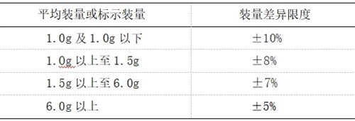 檢查法 取供試品10袋(瓶),除去包裝,分別精密稱定每袋(瓶)內容物的重量,求出每袋(瓶)內容物的裝量與平均裝量。每袋(瓶)裝量與平均裝量相比較[凡無含量測定的顆粒劑或有標示裝量的顆粒劑,每袋(瓶)裝量應與標示裝量比較],超出裝量差異限度的顆粒劑不得多于2袋(瓶),并不得有1袋(瓶)超出裝量差異限度1倍。