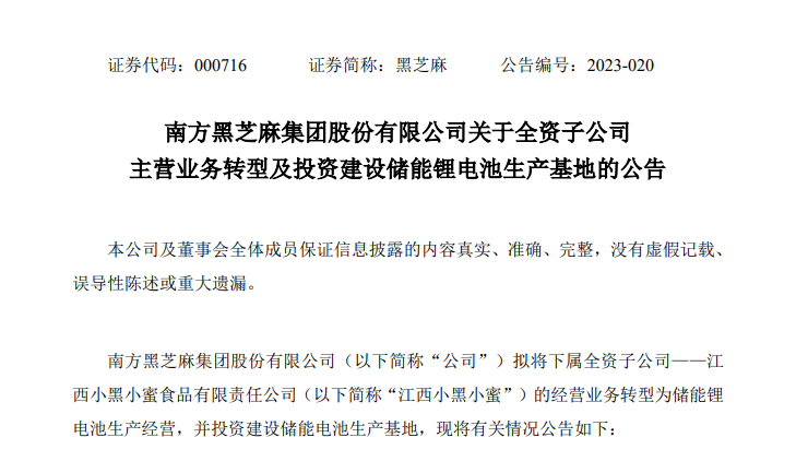 中國粉體網訊 3月31日晚,南方黑芝麻集團股份有限公司(簡稱“黑芝麻”,000716)發布公告,擬將下屬全資子公司——江西小黑小蜜食品有限責任公司的經營業務轉型為儲能鋰電池生產經營,并于江西南昌新建區投資35億元建設磷酸鐵鋰儲能鋰電池生產基地。