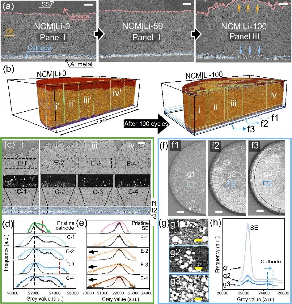 全固態電池的衰退機制極為復雜。先前研究指出全固態電池中存在正極活性顆粒的裂解、正極顆粒與電解質的元素互滲、電解質的開裂、負極鋰枝晶的生長以及固-固界面惡化問題。上述研究加深了對電極材料失效與電池性能衰退之間關系的理解。但由于缺乏合適的表征手段,目前仍不清楚正負極失效間的相互影響、相互作用關系,這嚴重制約了高比能、高安全固態電池的進一步發展。