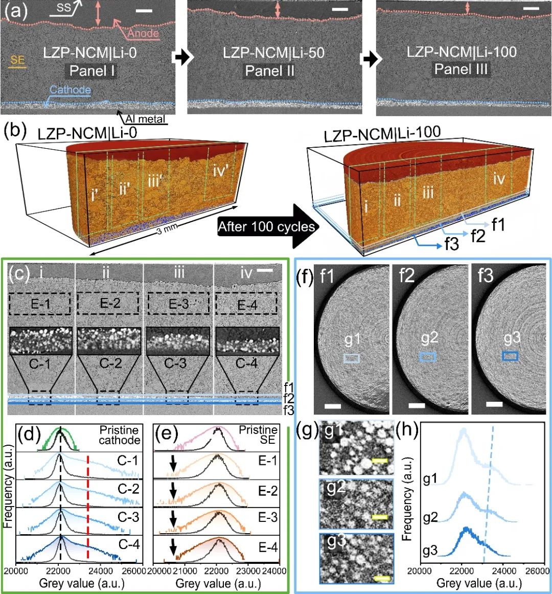 中國粉體網訊 硫化物基全固態電池具有高安全性和高理論能量密度,但其循環壽命短、庫侖效率低、容量衰退快。目前對固態電池的內在失效機制仍不明確,這主要是由于缺少可靠的先進表征手段。中國科學院青島生物能源與過程研究所崔光磊研究員課題組通過先進同步輻射X射線斷層掃描成像及多種表征技術和有限元模擬方法對由高鎳三元正極和鋰金屬負極組成的硫化物基全固態電池的衰退機制進行了深入研究,揭示出由鋰離子傳輸動力學的動態演變引起的正負極之間正強化的衰退機制,提出了全固態金屬鋰電池正負極相互依賴、相互關聯的失效行為。相關研究成果發表在Science Bulletin。