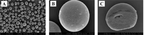 (A)全視圖 (B)單個微球表面圖 (C)單個微球切面圖