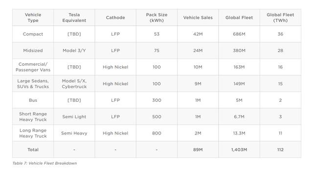 具體來說,緊湊型電動汽車(特斯拉車型未定)將配備53kWh磷酸鐵鋰電池,目標銷量4200萬輛。中型汽車(如特斯拉Model 3/Y)將配備75kWh磷酸鐵鋰電池,目標銷量2400萬輛。大型三廂車、SUV和貨車(如特斯拉Model S/X及Cybertruck電動皮卡)將配備100kWh高鎳電池,目標銷量900萬輛。長續航重卡(如特斯拉Semi電動卡車)將配備800kWh高鎳電池,目標銷量200萬輛。