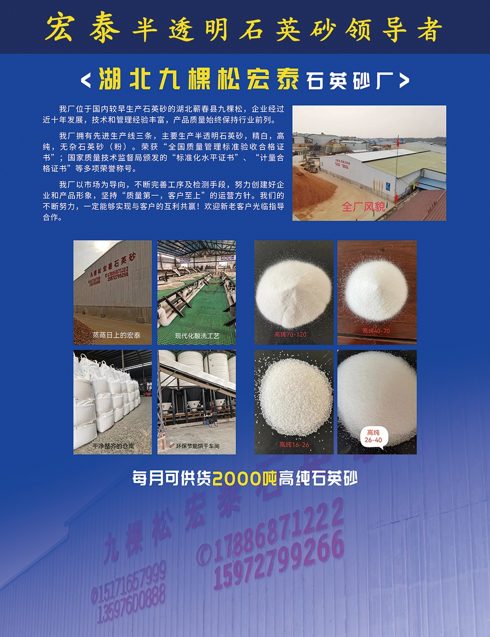 我廠位于國內較早生產石英砂的湖北薪春縣九棵松,企業經過近十年發展,技術和管理經驗豐富,產品質量始終保持行業前列。