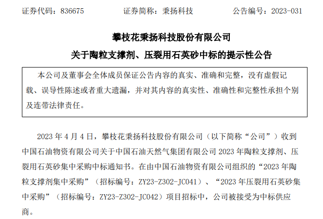 2023年4月4日,秉揚(yáng)科技收到中國(guó)石油物資有限公司關(guān)于中國(guó)石油天然氣集團(tuán)有限公司2023年陶粒支撐劑、壓裂用石英砂集中采購中標(biāo)通知書。在由中國(guó)石油物資有限公司組織的“2023年陶粒支撐劑集中采購”(招標(biāo)編號(hào):ZY23-Z302-JC041)、“2023年壓裂用石英砂集中采購”(招標(biāo)編號(hào):ZY23-Z302-JC042)項(xiàng)目招標(biāo)中,公司被接受為中標(biāo)供應(yīng)商。