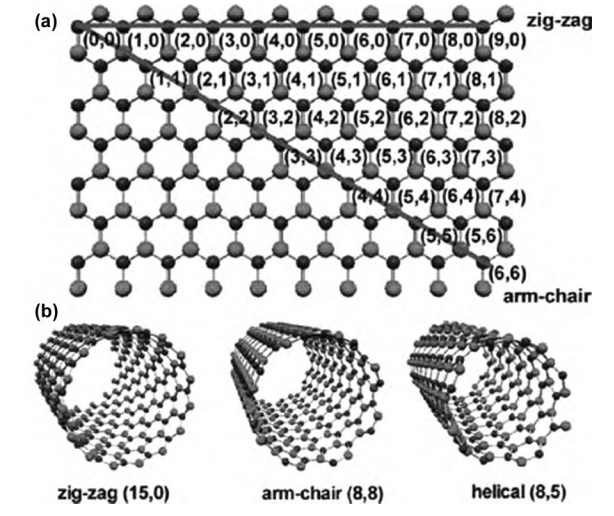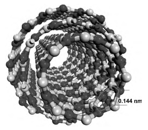 其中SWBNNT是由單層h-BN沿一個方向卷曲而形成管狀,根據B-N鍵的幾何排列方式,可把SWBNNT分為zigzag(0°)、arm-chair(30°)及helical(0°~30°)等3種構象,如下圖所示;MWBNNT是由多層h-BN卷曲而成。由于B-N共價鍵具有部分離子性(長度是0.144nm),導致了相鄰BN層之間相互作用力較大,使B和N原子沿著某一方向不斷疊加,優先形成雙層或多層管狀結構,從而提高了整體的穩定性,這種特殊的B-N堆積特點,使得BN很難形成單壁結構,多以多壁結構為主。
