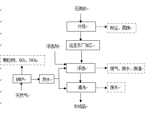浮選:把經(jīng)東廠加工的規(guī)格為50-200目半成品石英砂運回,放入浮選機內(nèi)加入浮選劑和40℃溫水(蒸汽鍋爐加熱)攪拌進行浮選清洗,浮選完畢后用真空機組設(shè)備去除水分。此過程產(chǎn)生浮選廢水。浮選工段主要去除云母、長石、含鐵礦物雜質(zhì)。