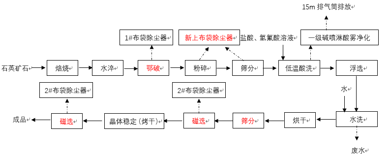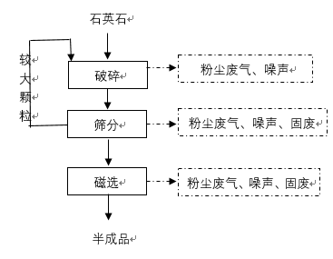 焙燒、水淬:將外購5-8cm石英礦石塊放在焙燒爐中焙燒,然后水淬,焙燒和水淬可以使石英石發(fā)生晶型轉(zhuǎn)變,并產(chǎn)生許多裂紋,礦石變得酥輕,易于破碎加工。焙燒在焙燒爐中進行,水淬廢水重復(fù)使用,定期補充新水,不外排。