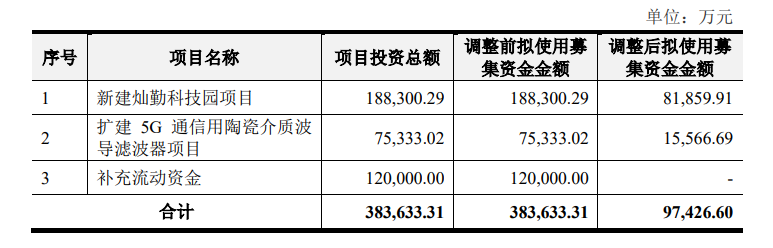 據(jù)悉,燦勤科技2020年申請科創(chuàng)板IPO,擬投入募集資金38.36億元,用于新建燦勤科技園項目、擴建5G通信用陶瓷介質(zhì)波導濾波器項目。其中,新建的燦勤科技園項目總投資18.83億元,該項目包含三個子項目分別為:“介質(zhì)波導濾波器產(chǎn)能擴張項目”、“新建HTCC、LTCC產(chǎn)品線項目”、“新建電子陶瓷研究院項目”。