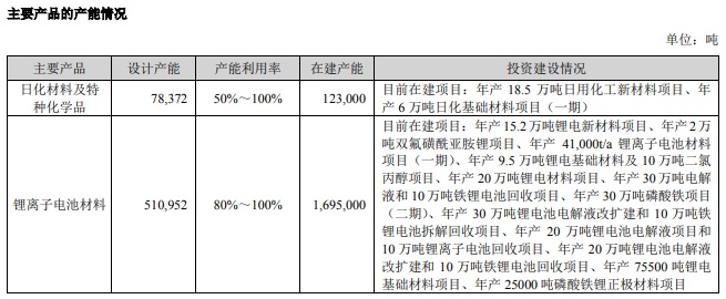 報(bào)告期內(nèi),天賜材料及時(shí)對(duì)內(nèi)部電解液和自產(chǎn)關(guān)鍵原料的產(chǎn)能進(jìn)行調(diào)整,六氟磷酸鋰、雙氟磺酰亞胺鋰(LiFSI)、雙氟草酸硼酸鋰(LiODFB)等多種電解質(zhì)及添加劑順利擴(kuò)產(chǎn)。新電解液產(chǎn)能如期投產(chǎn)并釋放,確保了產(chǎn)品能夠按時(shí)生產(chǎn)并完成交付。目前已有鋰電材料產(chǎn)能51.09萬(wàn)噸,在建產(chǎn)能169.5萬(wàn)噸。