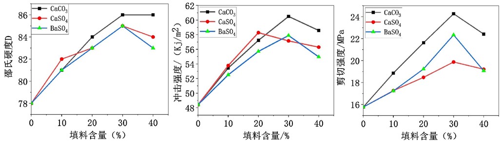 洪樹達等研究了碳酸鈣/硫酸鈣/硫酸鋇三種不同填料對聚氨酯/環氧樹脂膠粘劑(PU/EP)性能的影響,通過不同填料及其含量的材料性能對比發現在填料含量為30%時,PU/EP體系的不同填料都有最佳的力學性能。這是因為填料的添加是有上限的,適當的添加使得填料可以均勻的在分子鏈之間的空隙充填,過量時則會破換分子鏈結構。