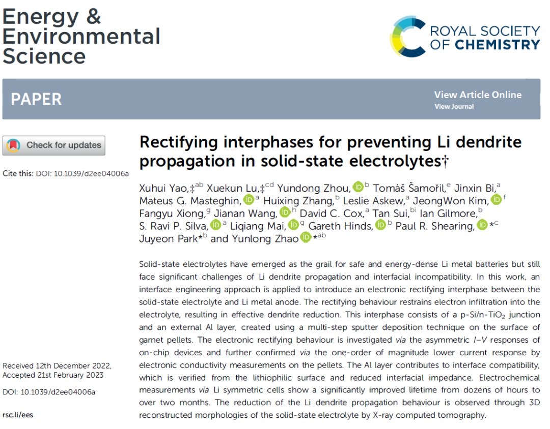近日,英國薩里大學、國家物理實驗室(NPL)趙云龍團隊聯合NPL和倫敦大學學院(UCL)等研究者,成功地在固態電解質和鋰金屬負極之間引入電子整流界面。該界面的整流作用限制了電子滲透到電解質中,從而有效減少了鋰枝晶的形成并顯著提高了電池的壽命。通過X射線計算機斷層掃描技術,團隊對固態電解質進行了三維形態重構,觀察到了在具有整流界面的樣品中鋰枝晶被有效抑制。相關成果以“Rectifying interphases for preventing Li dendrite propagation in solid-state electrolytes”為題發表在Energy&Environmental Science上。