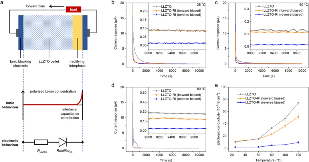 圖3(a)在恒流極化下,具有整流界面的固態電解質中的離子和電子行為示意圖。(b-d)在不同溫度下,采用Wagner–Hebb方法測得的電流相應分布;以及(e)對應的電子電導率。