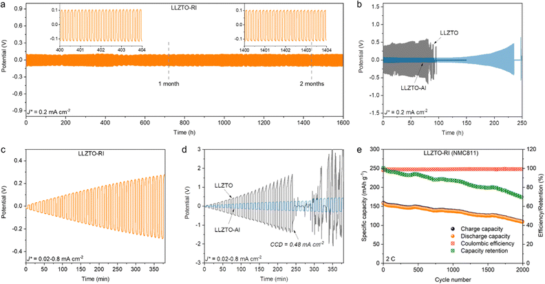 圖5用(a)LLZTO-RI、(b)LLZTO-Al和LLZTO固態電解質組裝的鋰對稱電池的循環性能。(c和d)鋰對稱式電池的極限電流密度測試。(e)采用NMC811正極組裝的全電池的循環性能。