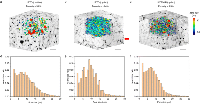 圖6(a–c)循環前后通過X射線斷層掃描重建的LLZTO和LLZTO-RI樣品的結構(黑色代表孔隙和裂紋),孔隙形態通過切角可視化,顏色編碼表示孔徑分布,并在(d–f)中進行量化。