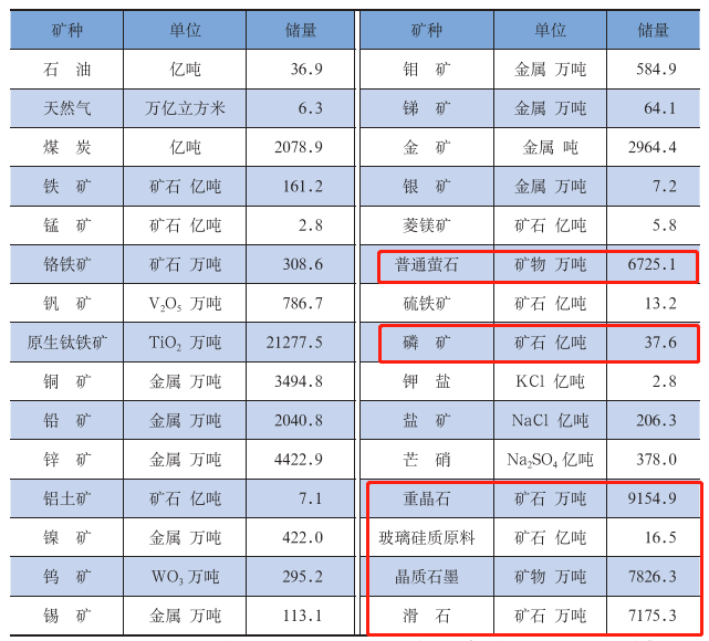 種,水氣礦產(chǎn)6種。其中,主要非金屬礦產(chǎn)儲量統(tǒng)計情況如下,普通螢石礦物67251.萬噸,磷礦37.6億噸,重晶石9154.9萬噸,玻璃硅質(zhì)原料16.5億噸,晶質(zhì)石墨7826.3萬噸,滑石7175.3萬噸。