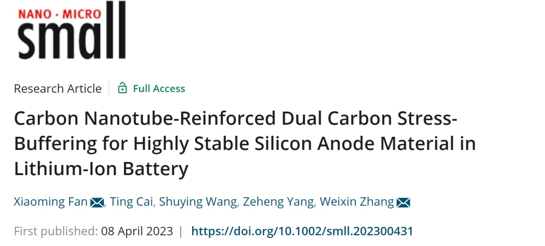 基于此,來自合肥工業大學的張衛新教授和范小明副教授在國際知名期刊Small上發表題為“Carbon Nanotube-Reinforced Dual Carbon Stress-Buffering for Highly Stable Silicon Anode Material in Lithium-Ion Battery”的研究論文。該研究利用檸檬酸誘導金屬有機框架(MOFs)原位均勻包覆硅納米顆粒,經熱處理后成功制備具有碳納米管增強的雙碳應力緩沖層的硅碳負極材料,將其應用于鋰離子電池電極材料展示出優異的長循環穩定性和倍率性能。