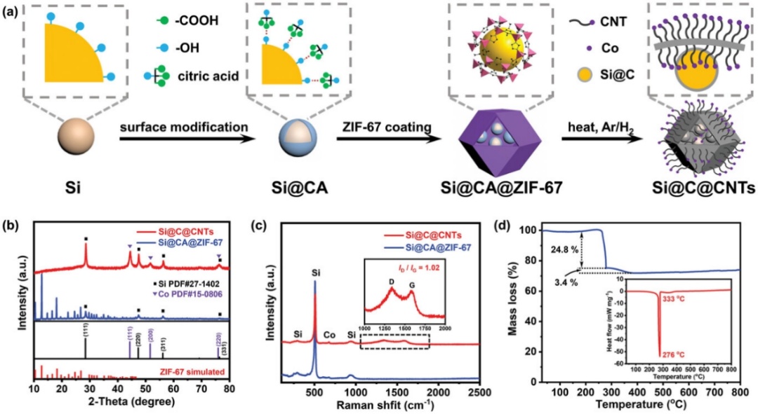 要點一:檸檬酸作為“雙功能劑”誘導ZIF-67原位包覆硅納米顆粒,熱解后形成碳納米管增強的雙碳應力緩沖層