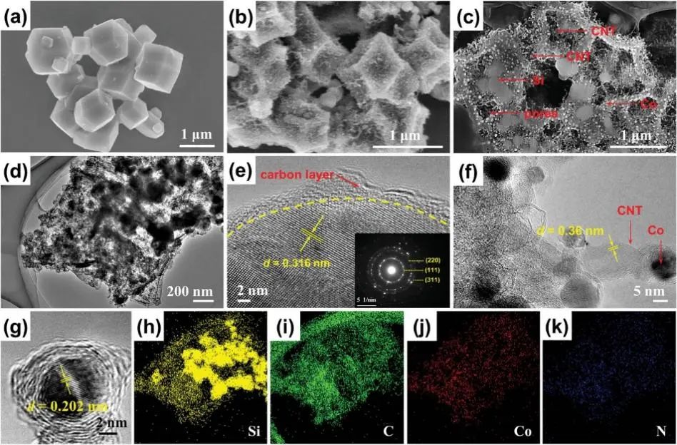 圖2Si@C@CNTs的形貌和微觀結構:(a)Si@CA@ZIF-67與(b)Si@C@CNTs的SEM圖,(c)Si@C@CNTs的截面SEM圖;Si@C@CNTs的(d)TEM,(e-g)HRTEM和(h-k)元素分布圖。