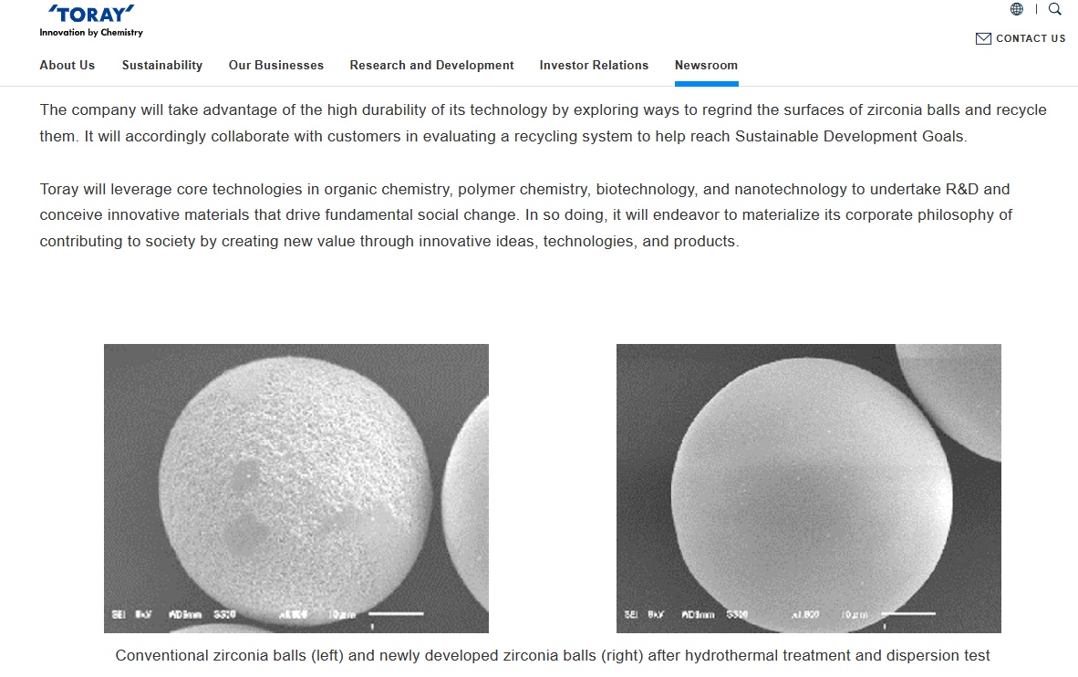 除此之外,東麗利用該產品的高耐久性,探索研磨氧化鋯球表面并回收利用的方法。未來將與客戶合作評估回收系統,以幫助實現可持續發展目標。