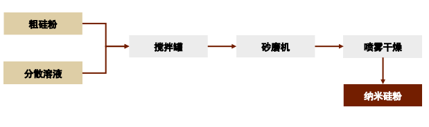 目前納米硅粉的制備主要采用自上而下和自下而上的2種方法。前者是利用物理的方法使塊狀硅原料從大到小不斷地破碎達到需求的尺寸,后者是利用物理或者化學的方法對硅源材料進行分解或者裂解,通過沉積的方法獲得所需尺寸的納米硅顆粒。研究較多得主要有化學氣相沉積法、等離子蒸發冷凝法和機械研磨法。由于國內對納米硅粉研制起步較晚,制作水平相對落后,主要以機械研磨法為主。美國,日本等國家的企業對納米硅粉的研究起步較早,日本帝人、美國杜邦等企業均可以用等離子蒸發冷凝法進行納米硅粉的制備。