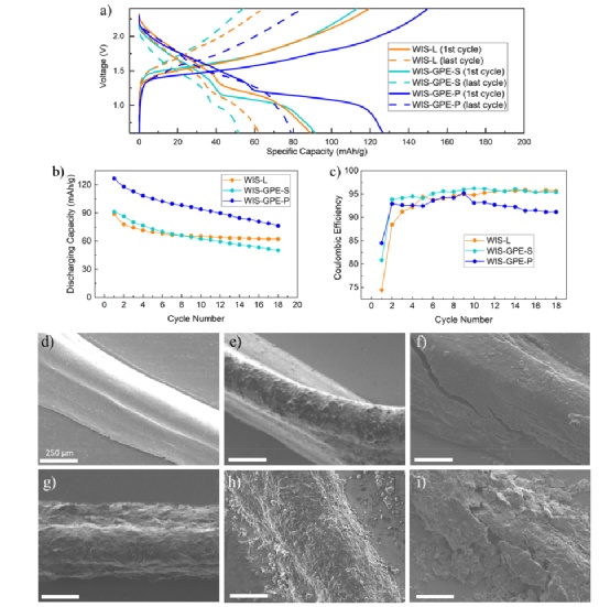 這可能是由于WIS-GPE在循環過程中膨脹并填充電極孔隙,或WIS-GPE的降解和體積變化,然后促成了形態上的演變。裂縫的形成可能導致容量損失,這與在兩種類型的WIS-GPE電池中觀察到的較低的庫侖效率相一致,與WIS-L電池相比。