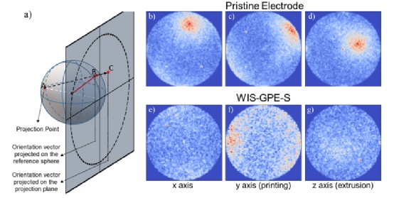 圖5.打印的TiS2電極沿不同軸線的界面正態分布:(a)IND分析的概念,(b-d)原始電極,和(e-g)在WIS-GPE-S中循環的電極。