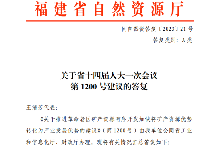中國(guó)粉體網(wǎng)訊 4月19日,福建省自然資源廳公開(kāi)“關(guān)于省十四屆人大一次會(huì)議第1200號(hào)建議的答復(fù)”相關(guān)內(nèi)容,其中明確:為了穩(wěn)定福建省的地礦隊(duì)伍,切實(shí)加強(qiáng)全省礦產(chǎn)資源的勘查開(kāi)發(fā)利用,促進(jìn)礦業(yè)的持續(xù)高質(zhì)量發(fā)展,福建省財(cái)政廳將持續(xù)保持資金的支持力度。