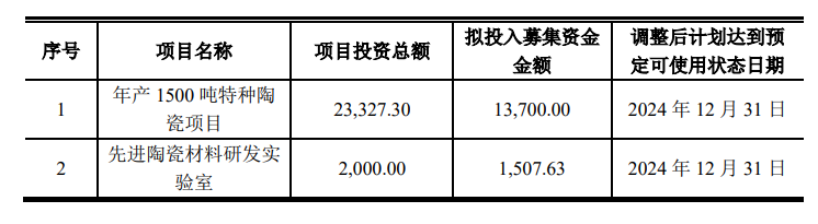 另外,在先進陶瓷項目中,為保障募投項目的順利實施,基于審慎原則,結合當前募集資金投資項目實際建設情況,在項目實施主體、投資用途和投資規模不變的情況下,擬對“年產1500噸特種陶瓷項目”和“先進陶瓷材料研發實驗室”進行延期,擬將建設期延期至2024年12月31日。