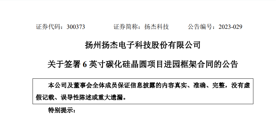 中國粉體網(wǎng)訊 4月20日,揚(yáng)州揚(yáng)杰電子科技股份有限公司(簡稱:揚(yáng)杰電子)發(fā)布公告,公司已于4月18日與揚(yáng)州市邗江區(qū)政府簽署《6英寸碳化硅晶圓項(xiàng)目進(jìn)園框架合同》,擬在當(dāng)?shù)赝顿Y新建6英寸碳化硅晶圓生產(chǎn)線項(xiàng)目,總投資約10億元。