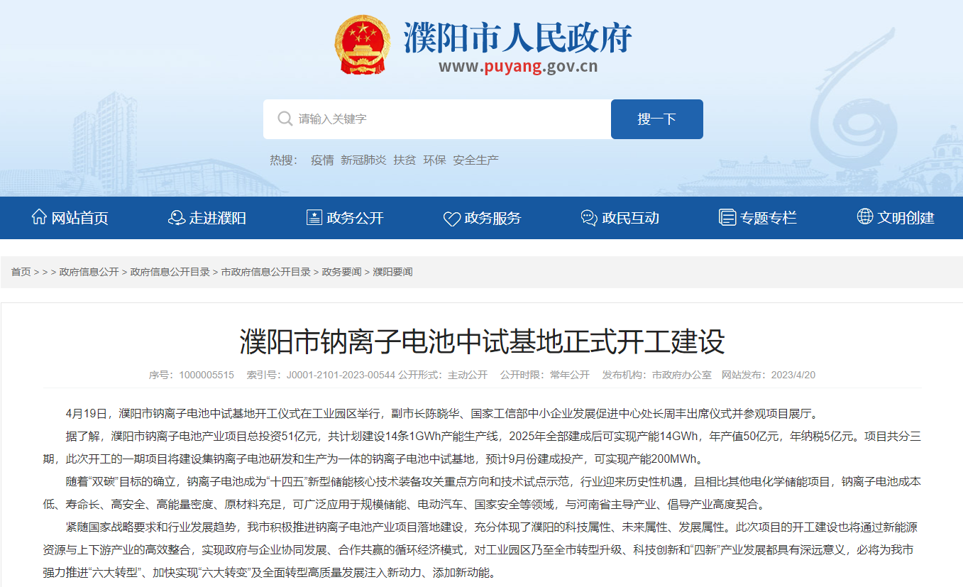 據(jù)了解,濮陽市鈉離子電池產(chǎn)業(yè)項目總投資51億元,共計劃建設14條1GWh產(chǎn)能生產(chǎn)線,2025年全部建成后可實現(xiàn)產(chǎn)能14GWh,年產(chǎn)值50億元,年納稅5億元。項目共分三期,此次開工的一期項目將建設集鈉離子電池研發(fā)和生產(chǎn)為一體的鈉離子電池中試基地,預計9月份建成投產(chǎn),可實現(xiàn)產(chǎn)能200MWh。