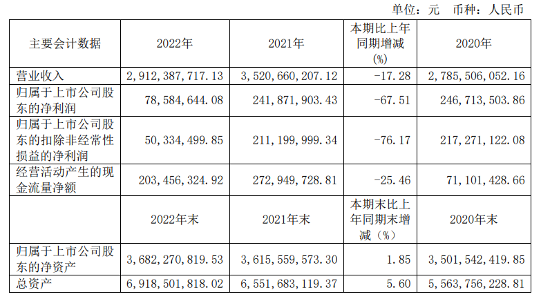 中國粉體網訊 4月21日晚間,博敏電子披露2022年年度報告,報告顯示,公司2022年營業收入約29.12億元,同比減少17.28%;歸屬于上市公司股東的凈利潤約7858萬元,同比減少67.51%。