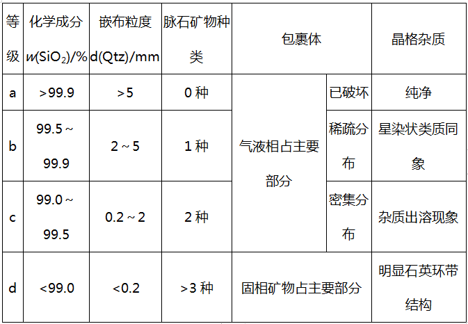 同時,二者的加工工藝也有一定的差別,這一差別是由石英原礦的提純潛力所決定的,一般是根據其提純所能達到的極限純度作為其區分的主要因素,而提純潛力的判別可以具體依據化學成分、嵌布粒度、脈石礦物、包裹體和晶格雜質5個關鍵評價指標,這些因素之間的關系常常交叉耦合,構成了高純石英原料的評價因子。依據我們實驗室的研究成果,我們認為,當石英原料在以上5個關鍵評價指標中有3個及以上指標達到a級時(表1),可以推薦為高純石英原料。而無法滿足高純石英原料要求,但也具有良好的可選性和穩定性的樣品,則可以作為光伏玻璃用石英砂原料進行加工。